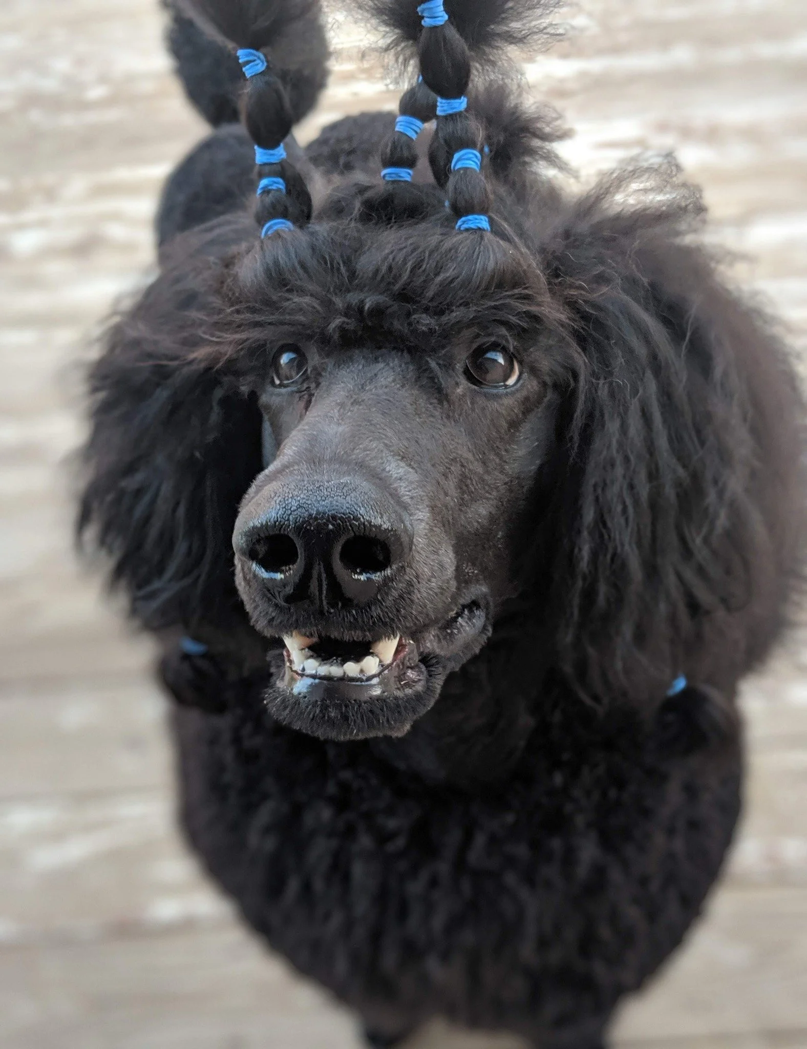 Ask your groomer to trim above your dog’s eyes or keep the coat in bands.